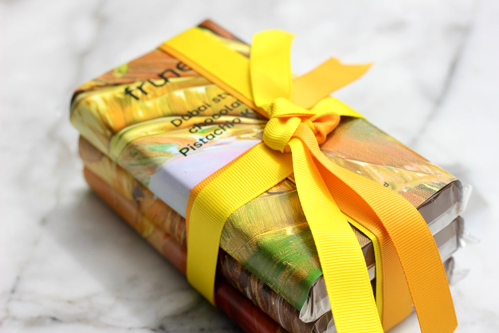 Dubai Chocolate Gift Pack – Trio Tiles with RibbonA luxurious trio of our signature Dubai-style chocolate tiles, elegantly packed and tied with a ribbon for the perfect gift.